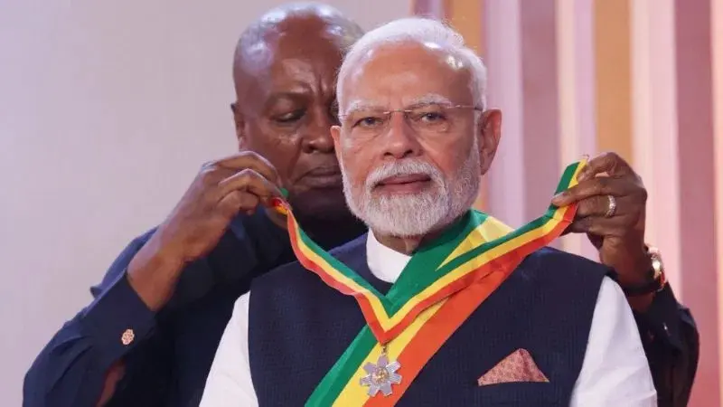 5 ದೇಶಗಳ ಪ್ರವಾಸದಲ್ಲಿರುವ ಪ್ರಧಾನಿ ನರೇಂದ್ರ ಮೋದಿ ಮೊದಲು ಘಾನಾ ದೇಶಕ್ಕೆ ಭೇಟಿ ನೀಡಿದ್ದಾರೆ. 30 ವರ್ಷಗಳಲ್ಲಿ ಭಾರತೀಯ ಪ್ರಧಾನಿಯೊಬ್ಬರು ನೀಡಿದ ಮೊದಲ ಭೇಟಿ ಇದಾಗಿದೆ. ಈ ಸಂದರ್ಭದಲ್ಲಿ ಪ್ರಭಾವಶಾಲಿ ಜಾಗತಿಕ ನಾಯಕ ಎಂದು ಗುರುತಿಸಿ ಘಾನಾದ ಅಧ್ಯಕ್ಷ ಜಾನ್ ಡ್ರಾಮಣಿ ಮಹಾಮ ಅವರು ಮೋದಿಗೆ ರಾಷ್ಟ್ರೀಯ ಗೌರವ `ಆಫೀಸರ್ ಆಫ್ ದಿ ಆರ್ಡರ್ ಆಫ್ ದಿ ಸ್ಟಾರ್’ ಪ್ರಶಸ್ತಿಯನ್ನು ನೀಡಿ ಗೌರವಿಸಿದ್ದಾರೆ